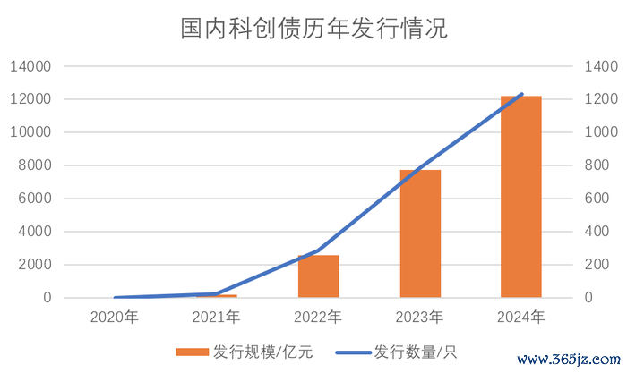 2023年全年新发各类科创债786只,发行规模7700亿元,同比分别增长1.79倍和1.96倍;2024年,我国科创债发行数量首次破千,发行规模站上万亿元门槛,分别达到1228只和1.22万亿元。