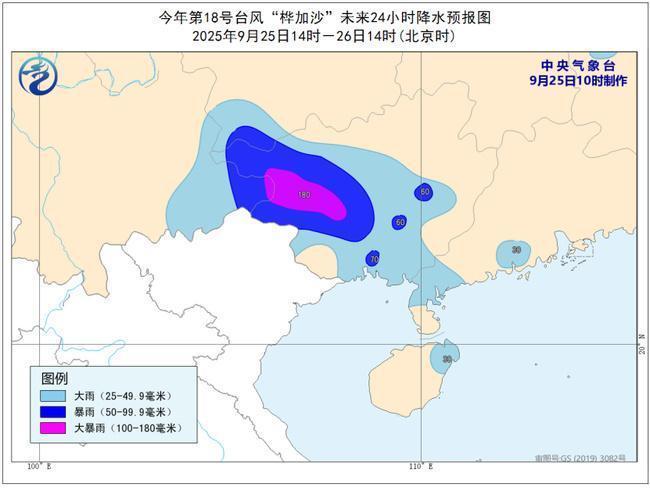 r降水预报:25日14时至26日14时,广西中南部、云南东南部、贵州南部、广东西部和北部、海南岛东部等地部分地区有大到暴雨,其中,广西西南部、云南东南部等地部分地区有大暴雨(100~180毫米)。