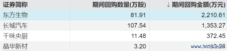 4家上市公司股票获回购,东方生物回购金额最高4家上市公司股票获回购,东方生物回购金额最高
